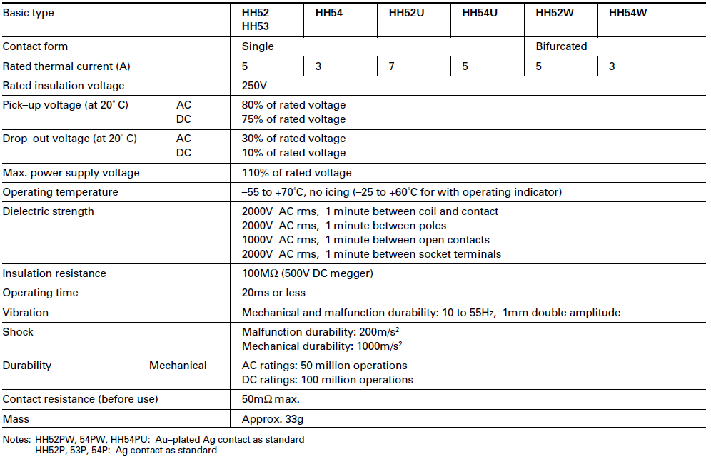 • The HH52, 53 and 54 are a series of miniature general purpose relays specially designed for users demanding small size, sturdy construction and high electrical capacity. Mechanisms are furnished in polycarbonate dust-proof enclosures and are recommended for a multitude of electrical control applications for their reliability and compact size. Continuous duty coils, either AC or DC are available for voltages up to 240V AC or 120V DC. Contacts can be supplied in 2PDT, 3PDT, 4PDT arrangements. Continuous current ratings are 3, 5 and 7 Amps. Many terminal types are available for solder, plug-in or printed circuit board mounting.